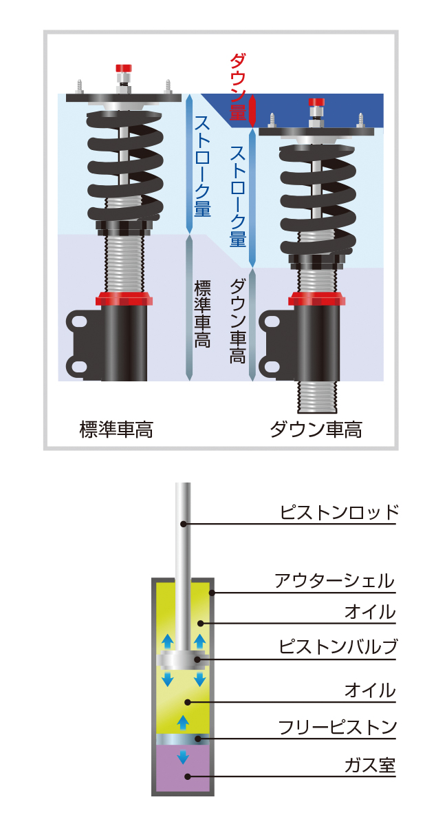 - 車高を変えてもストローク量が変わらないため、乗り心地の変化が少なくなります。